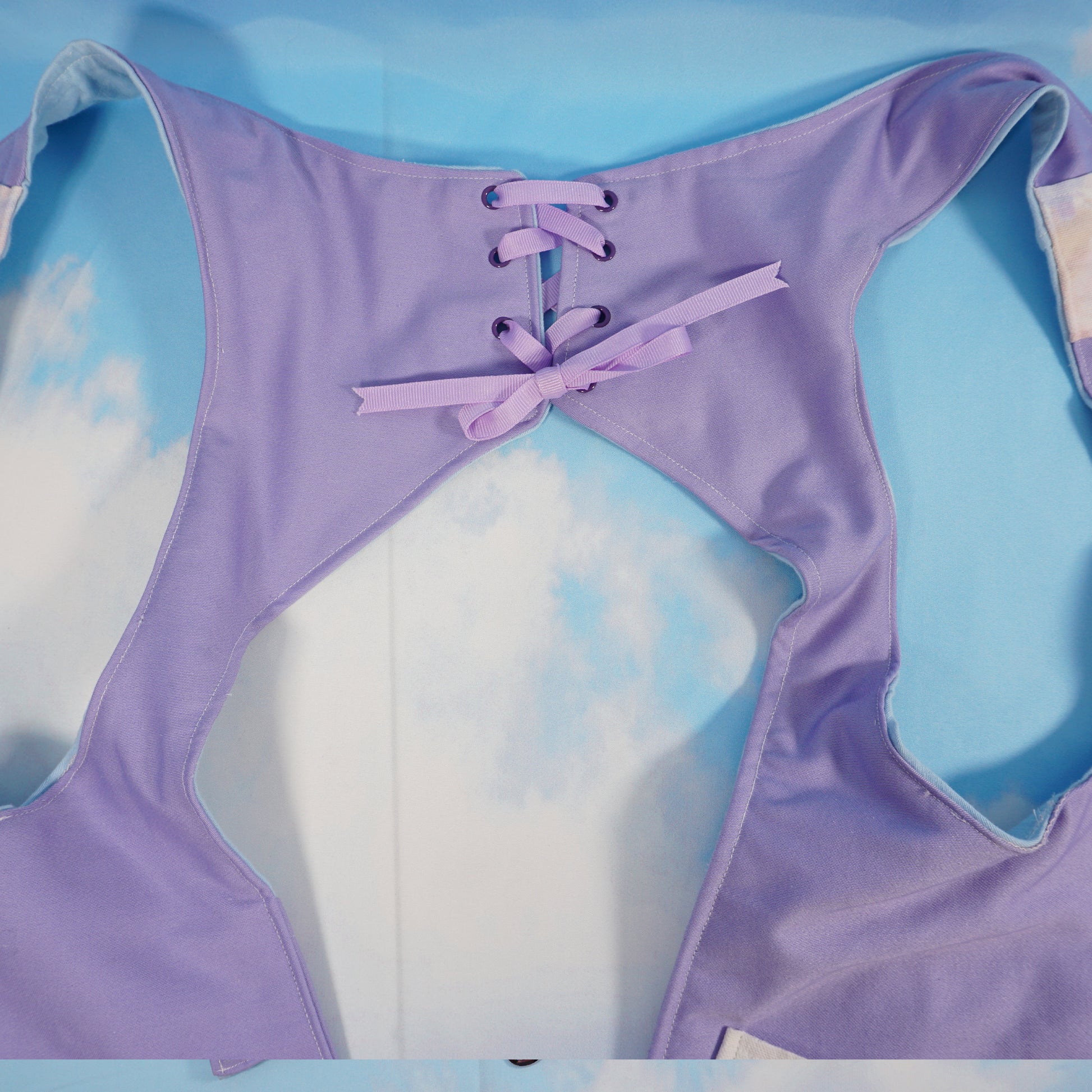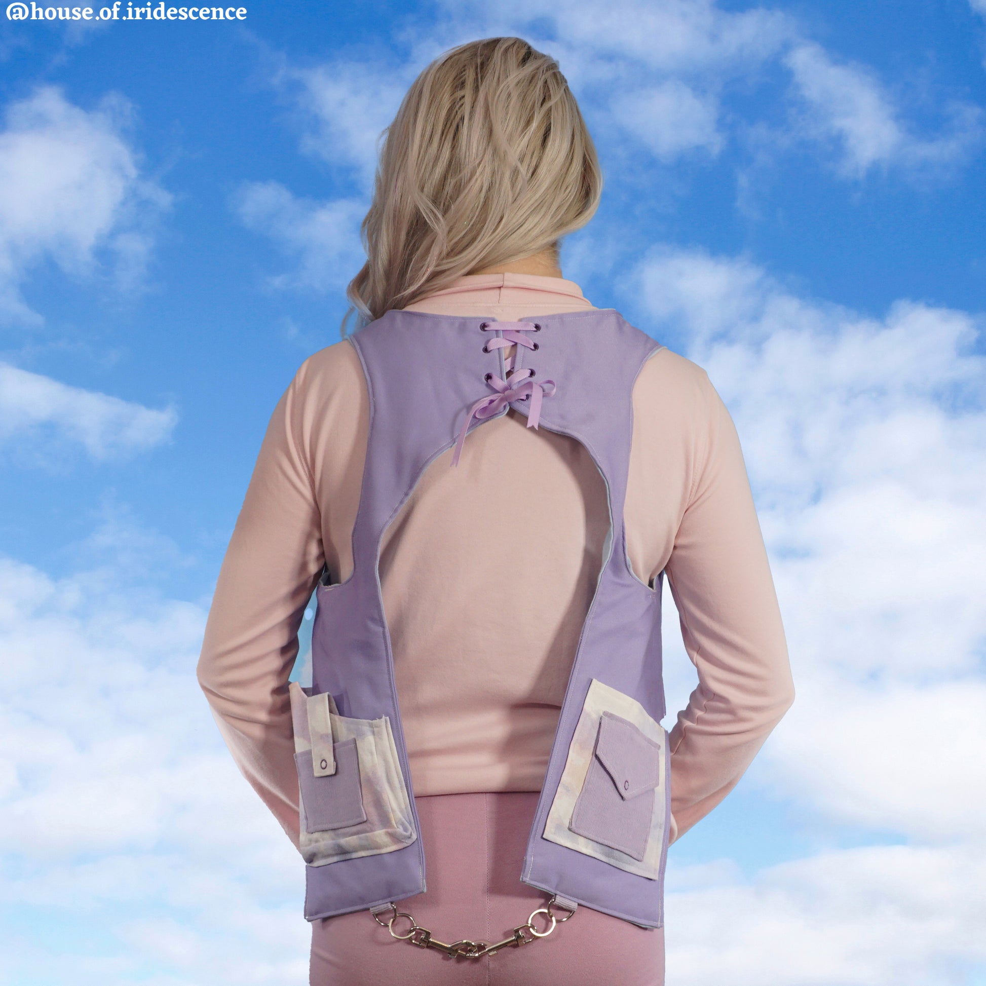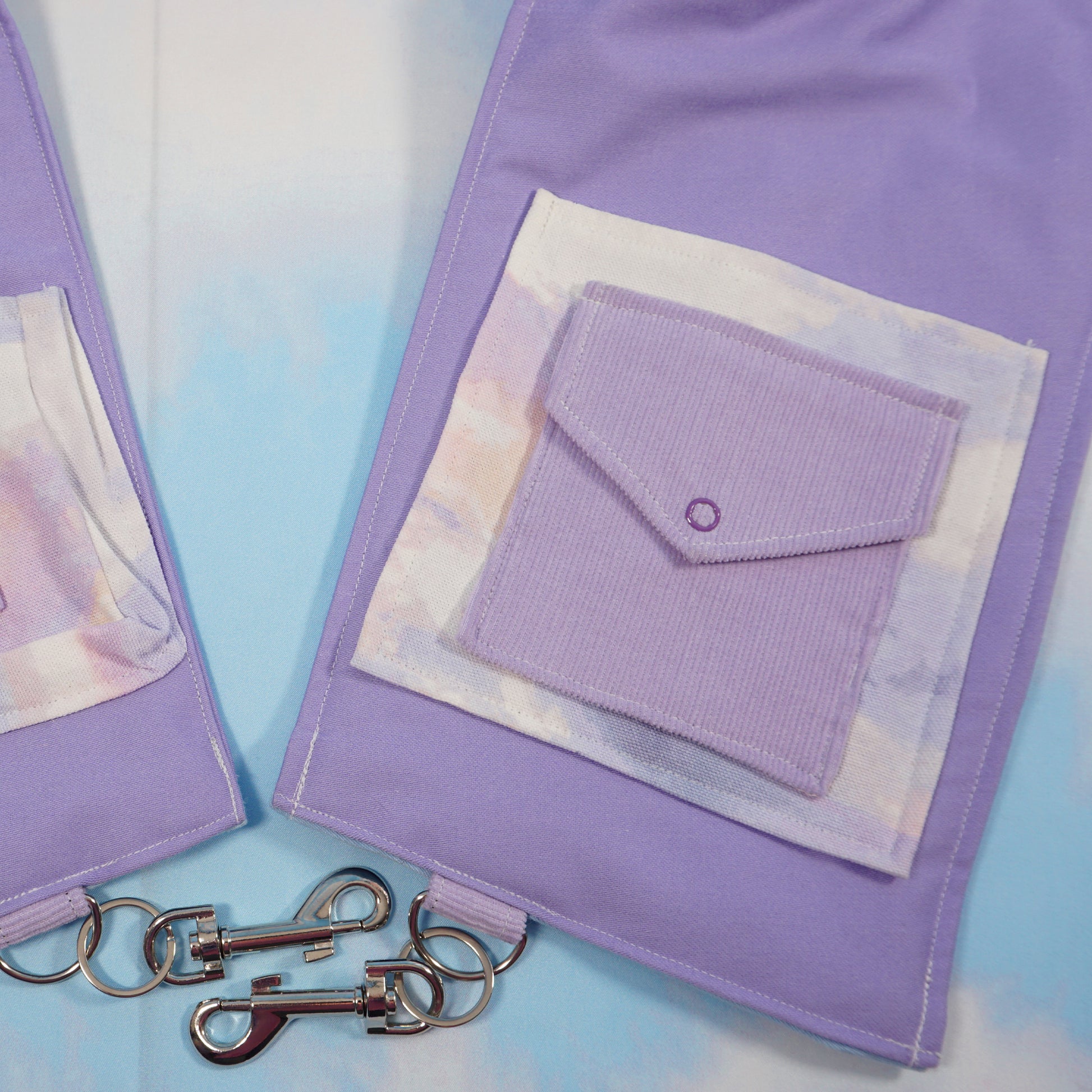 Our classic holster vest design in a pastel purple and blue. Accented by a pastel cloud fabric for the pockets. You know we love a pastel moment here! It is one of our holster vests so you know it has plenty of pockets (6 total) for all your everyday treasures and necessities.