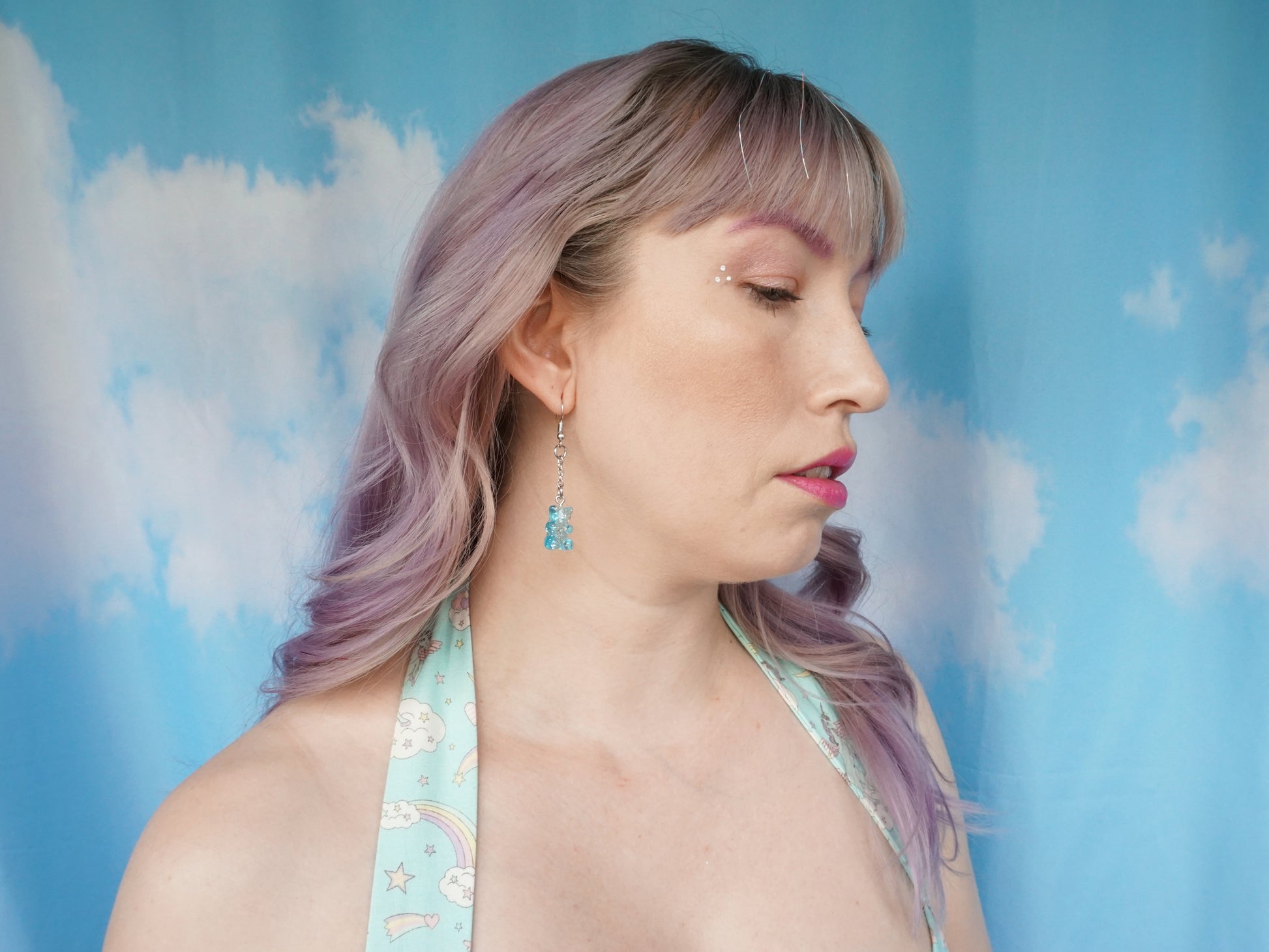 You know them, you love eating them, now you can wear them! Gummy bears! A variety of colors available all accented with a dangle stainless steel chain.