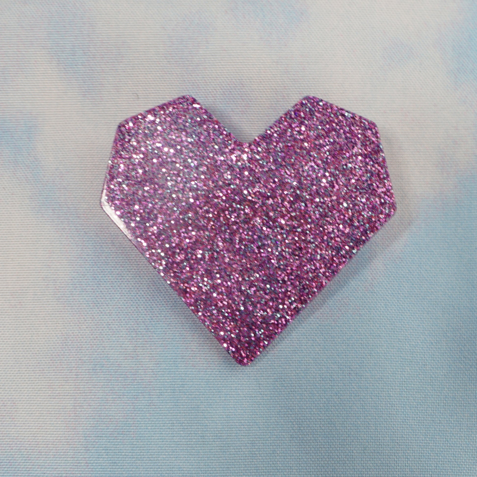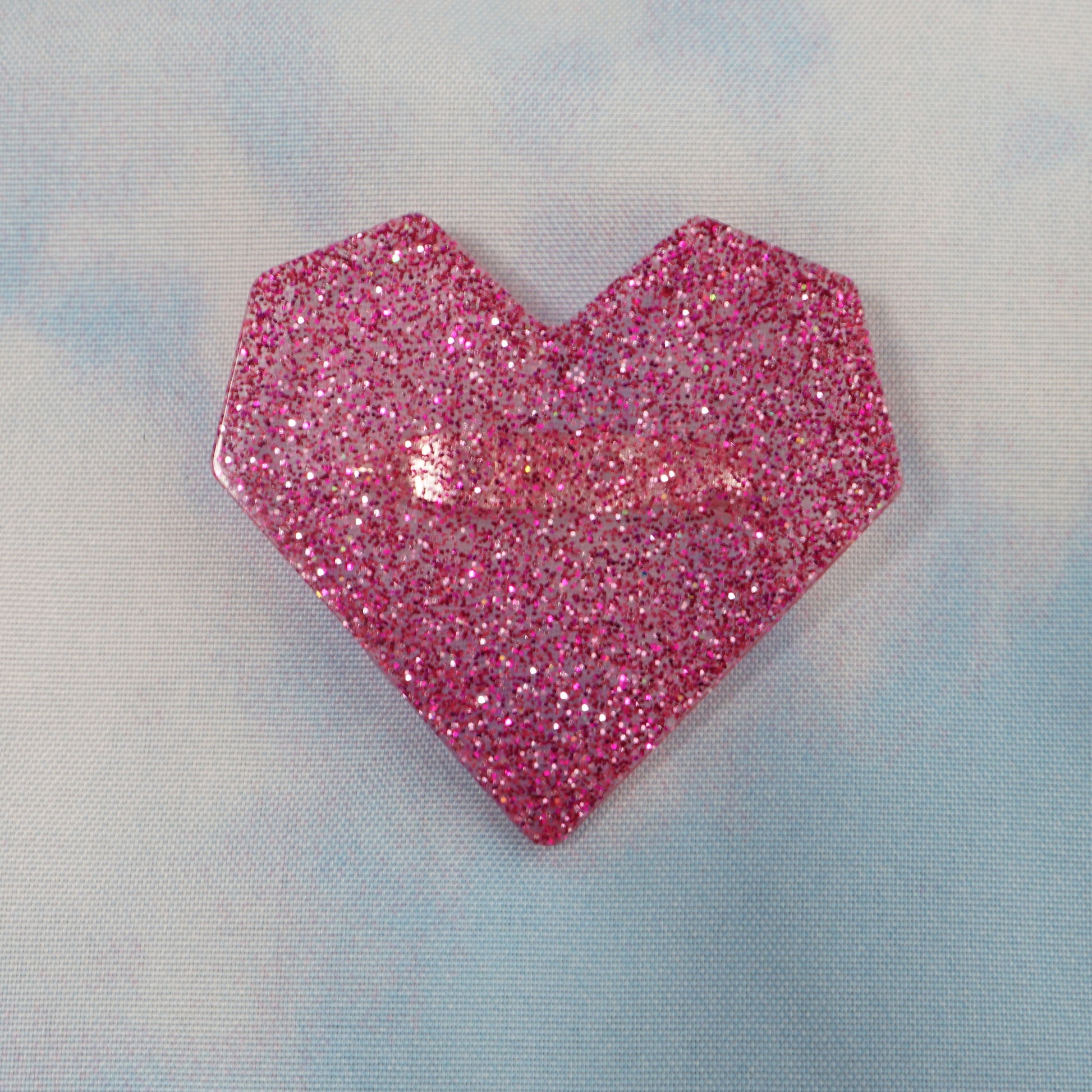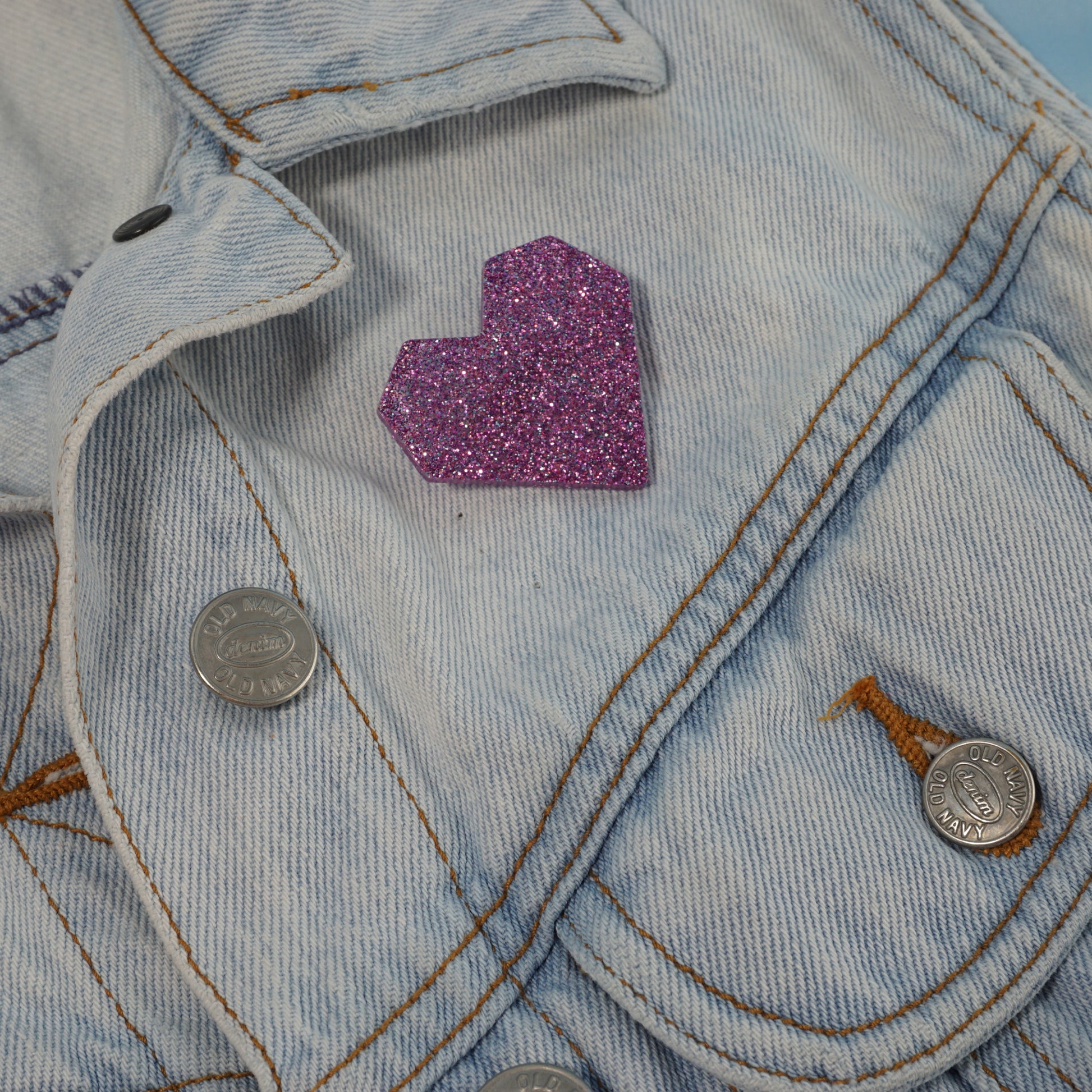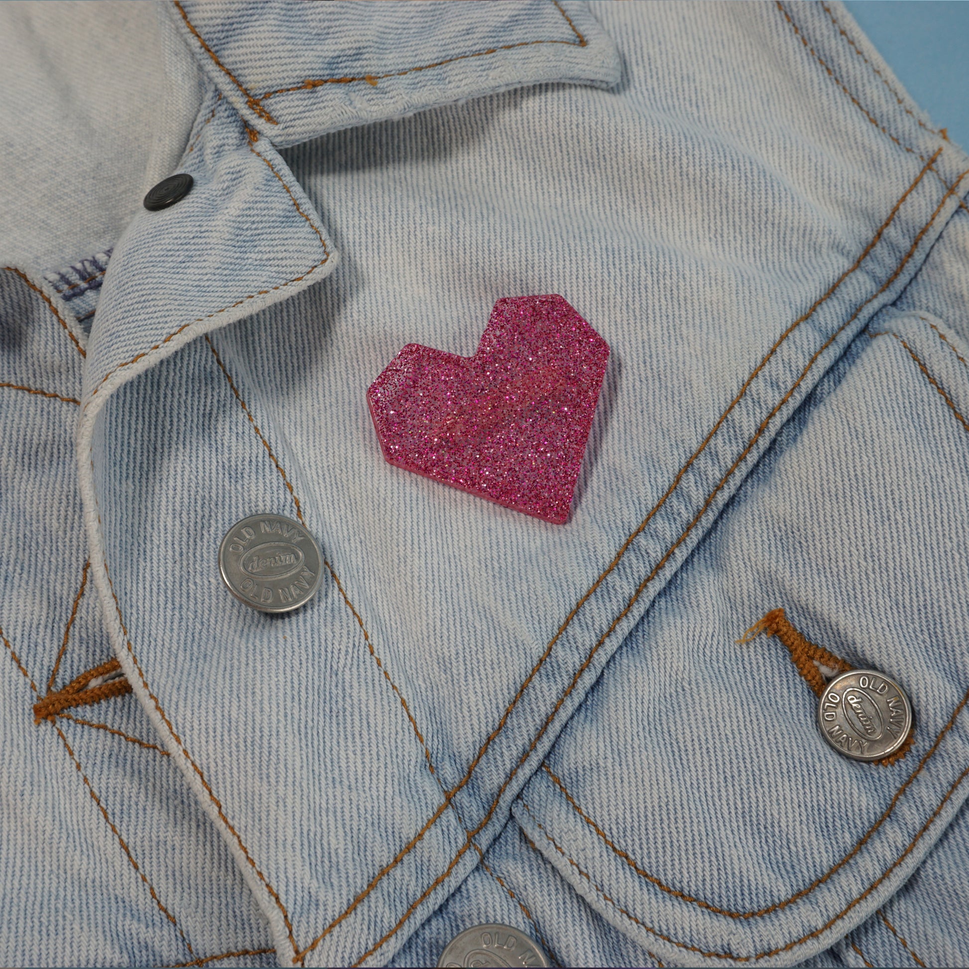 Heart shaped pins to add some flair to your jacket, vest, or sweater! Handmade using resin and glitter. Colors vary.