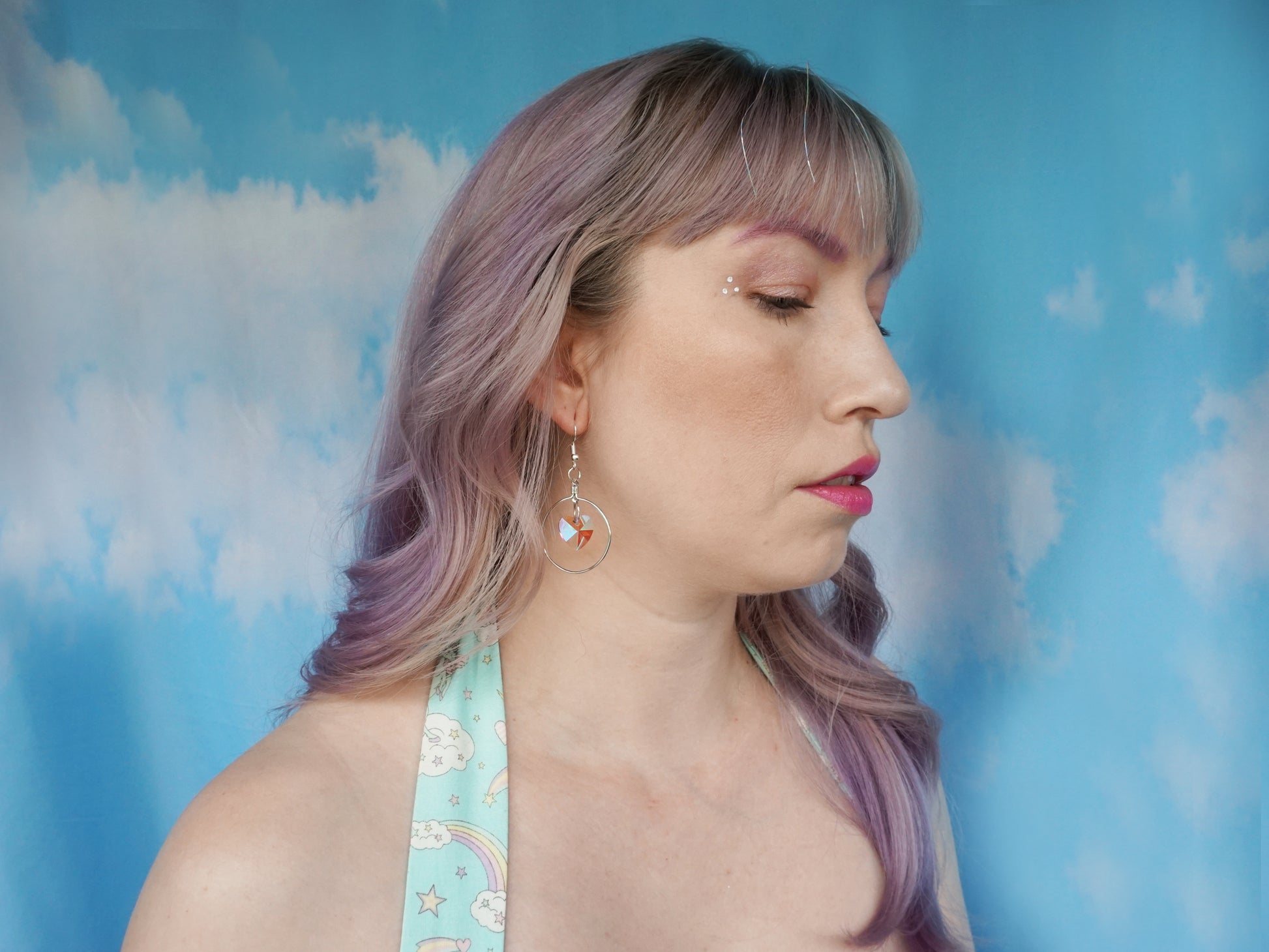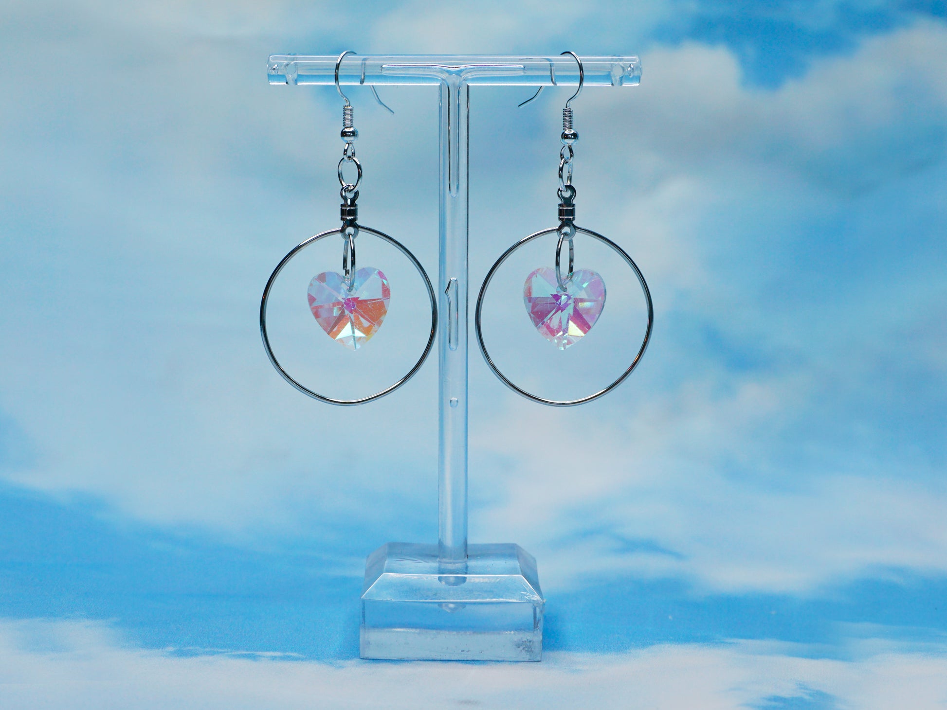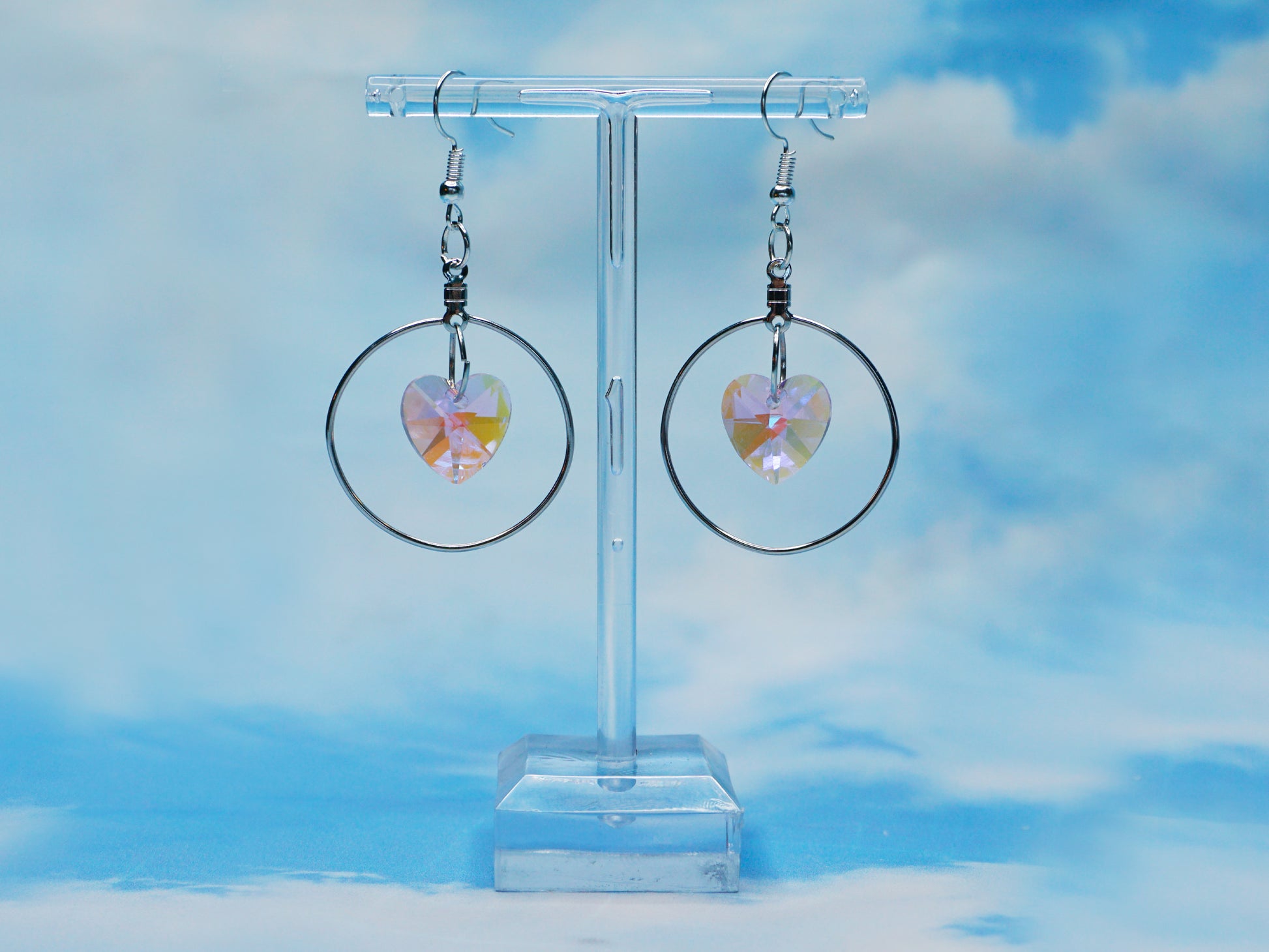 Handmade with glass hearts, stainless steel circles, and stainless steel earring hooks or hoops.
