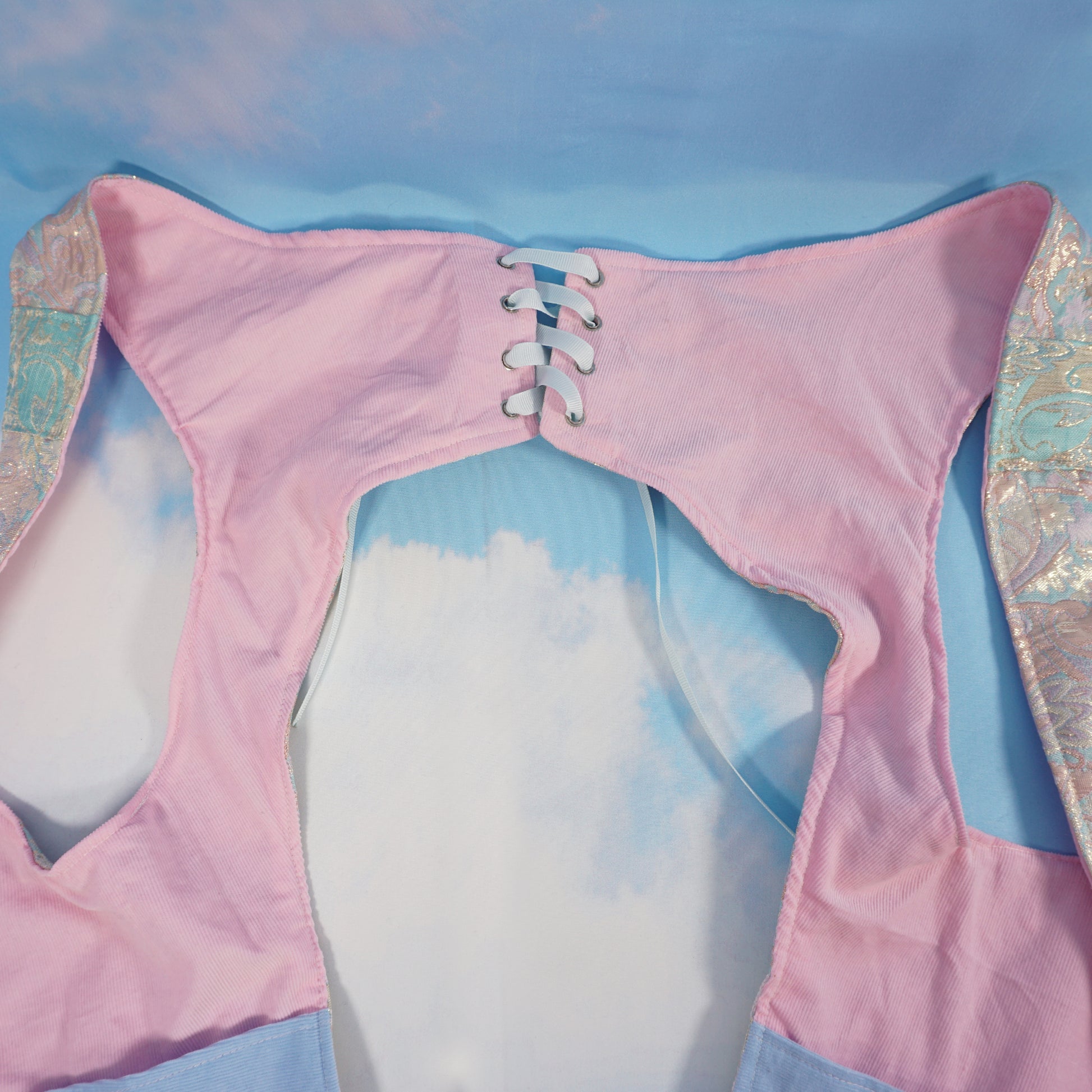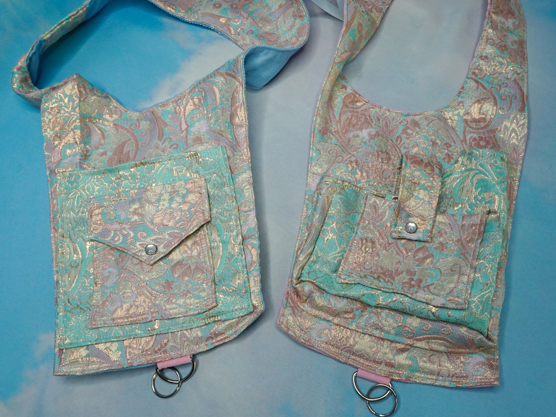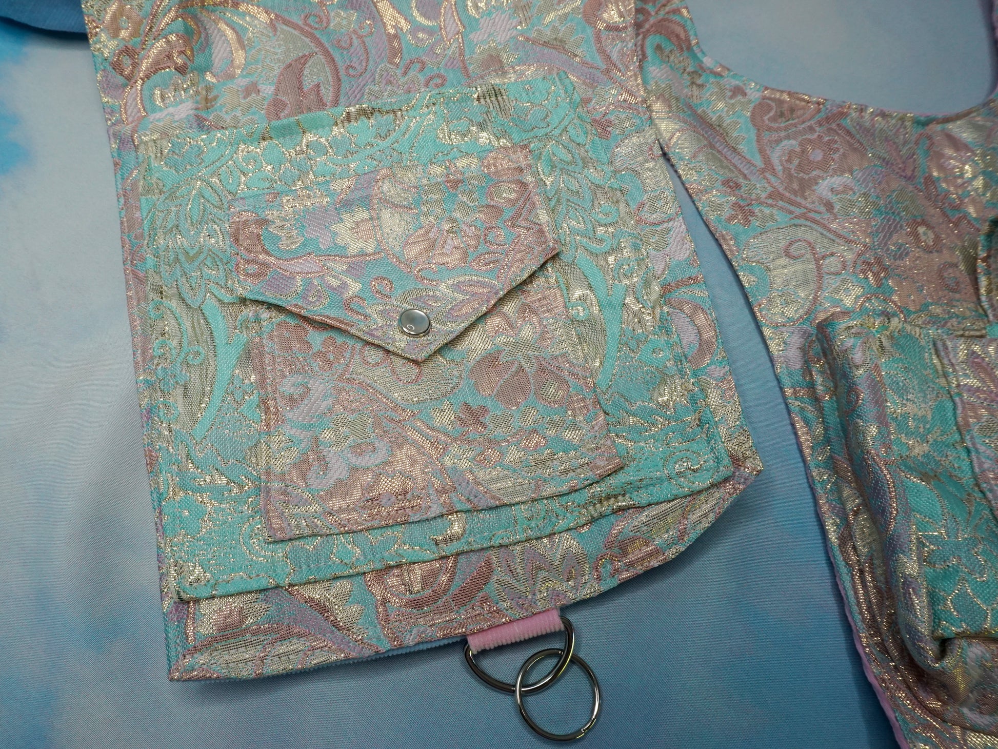 Our favorite pastel brocade fabric made into a one sided holster vest. For those that don't need or want a reversible style vest. Still with plenty of pockets (6 total).