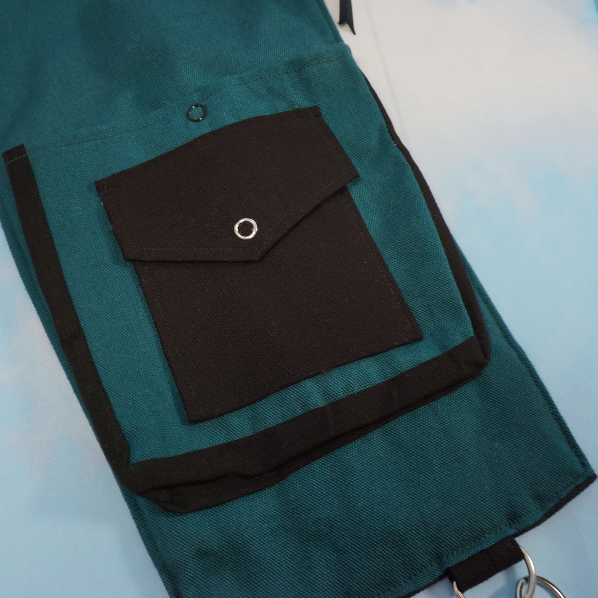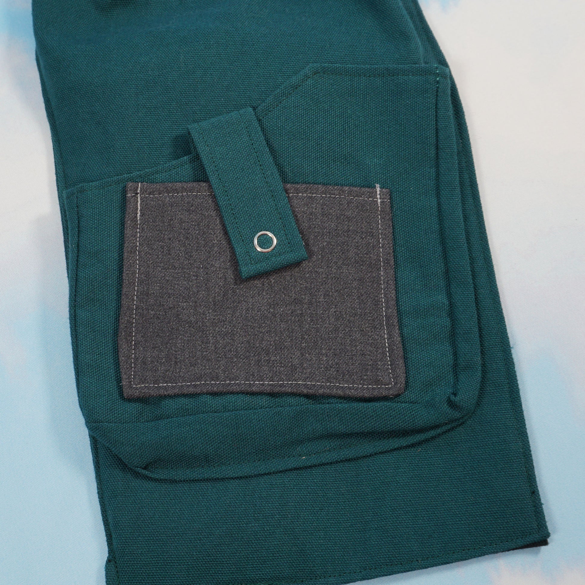 Six pockets total. Cotton canvas fabric. Metal attachments .