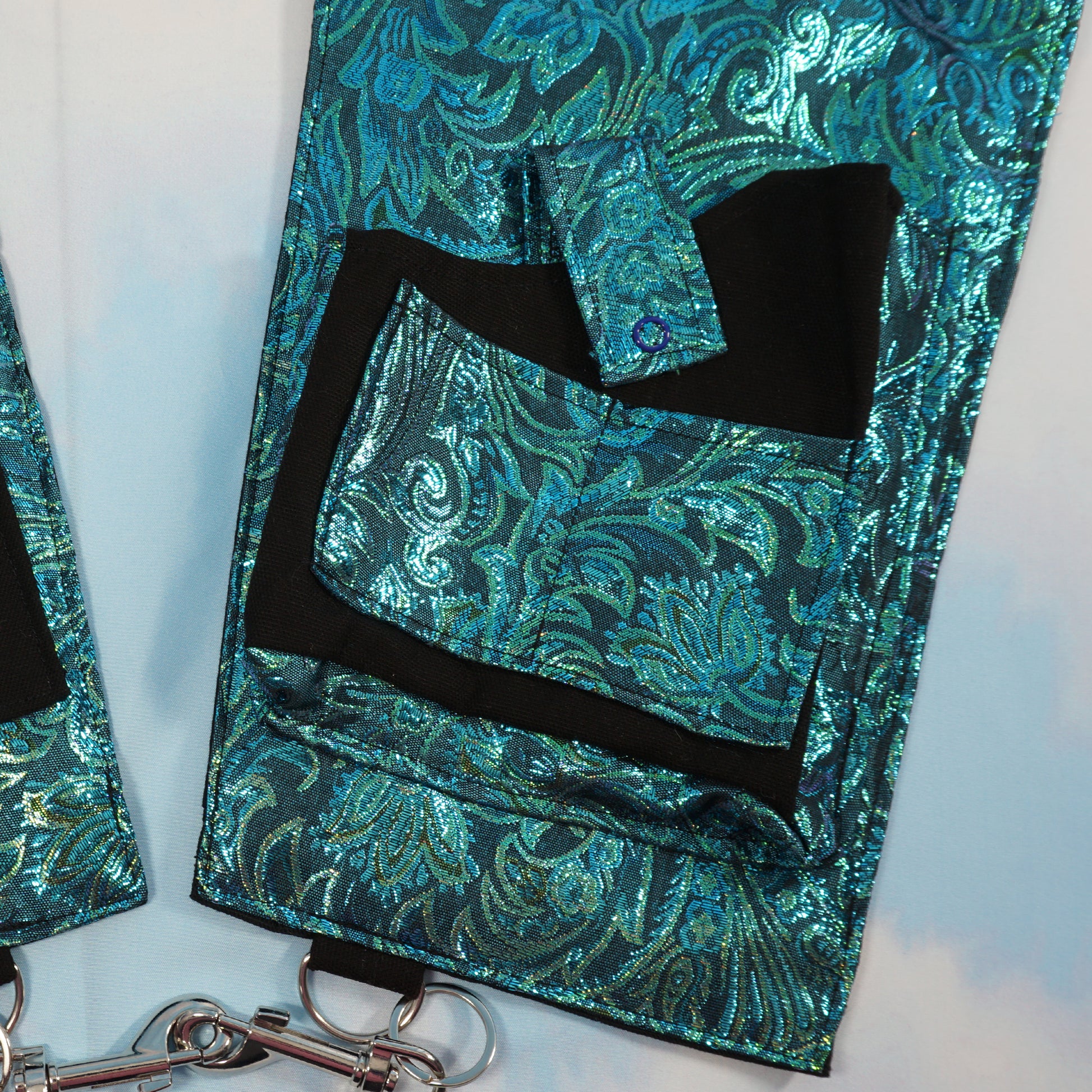 Love the teal brocade fabric of the reversible holster vest but the price just isn't within budget? Well introducing the one sided teal brocade holster vest! Still plenty of pockets (6 total), just not reversible...